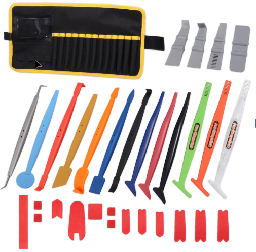 Este completo set de 18 herramientas es ideal para trabajos de instalación, ajuste y acabado en superficies delicadas del vehículo, permitiendo acceder a zonas difíciles sin dañar materiales.